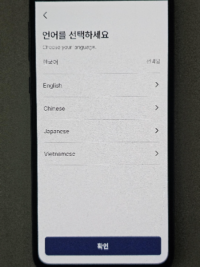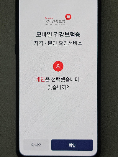 2. 모바일 건강보험증을 실행하고, 개인입니까? 선택한 후 확인을 누릅니다. 언어를 선택한 후 확인을 누릅니다.