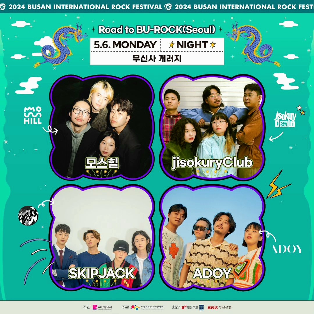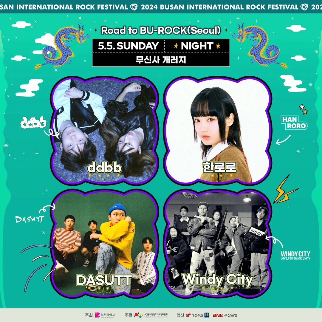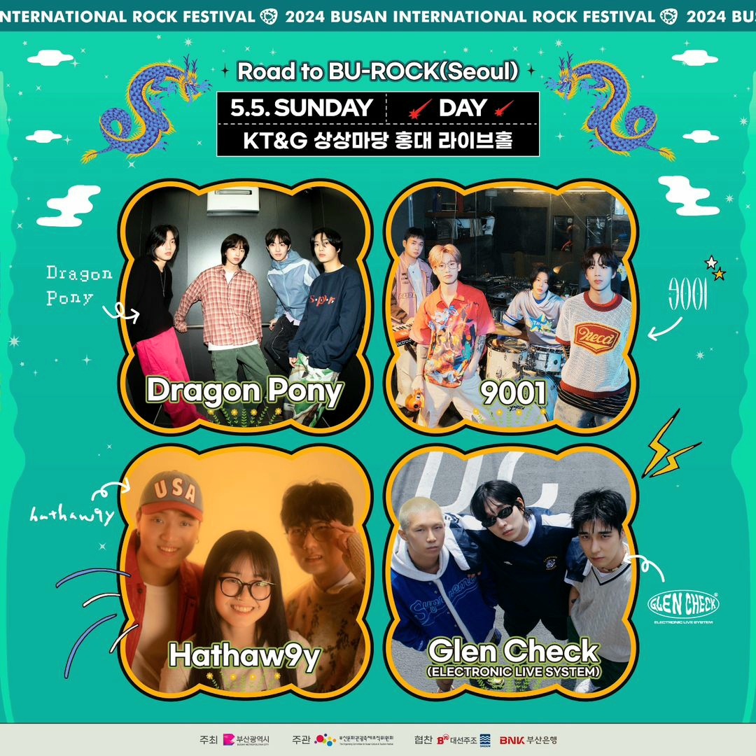 2024부산국제록페스티벌의 사전행사인 로드 투 부락(Road to BU-ROCK)의 첫 여정이 시작되는 곳은 서울 홍대입니다. 홍대의 KT&G상상마당 홍대 라이브홀과 무신사 개러지에서 진행됩니다. DAY 공연은 KT&G 상상마당 홍대 라이브홀, NIGHT 공연은 무신사 개러지에서 진행됩니다. 2024년 5월 5일 일요일 KT&G 상상마당 홍대 라이브홀의 라인업은 Dragon Pony, 9001, Hathaw9y, Glen Check(ELECTRONIC LIVE SYSTEM)이고, 무신사 개러지의 라인업은 ddbb, 한로로, DASUTT, Windy City입니다. 2024년 5월 6일 월요일 KT&G 상상마당 홍대 라이브홀의 라인업은 음율, THE FIX, 민수, 이상은이고, 무신사 개러지의 라인업은 모스힐, jisokuryClub, SKIPJACK, ADOY입니다.