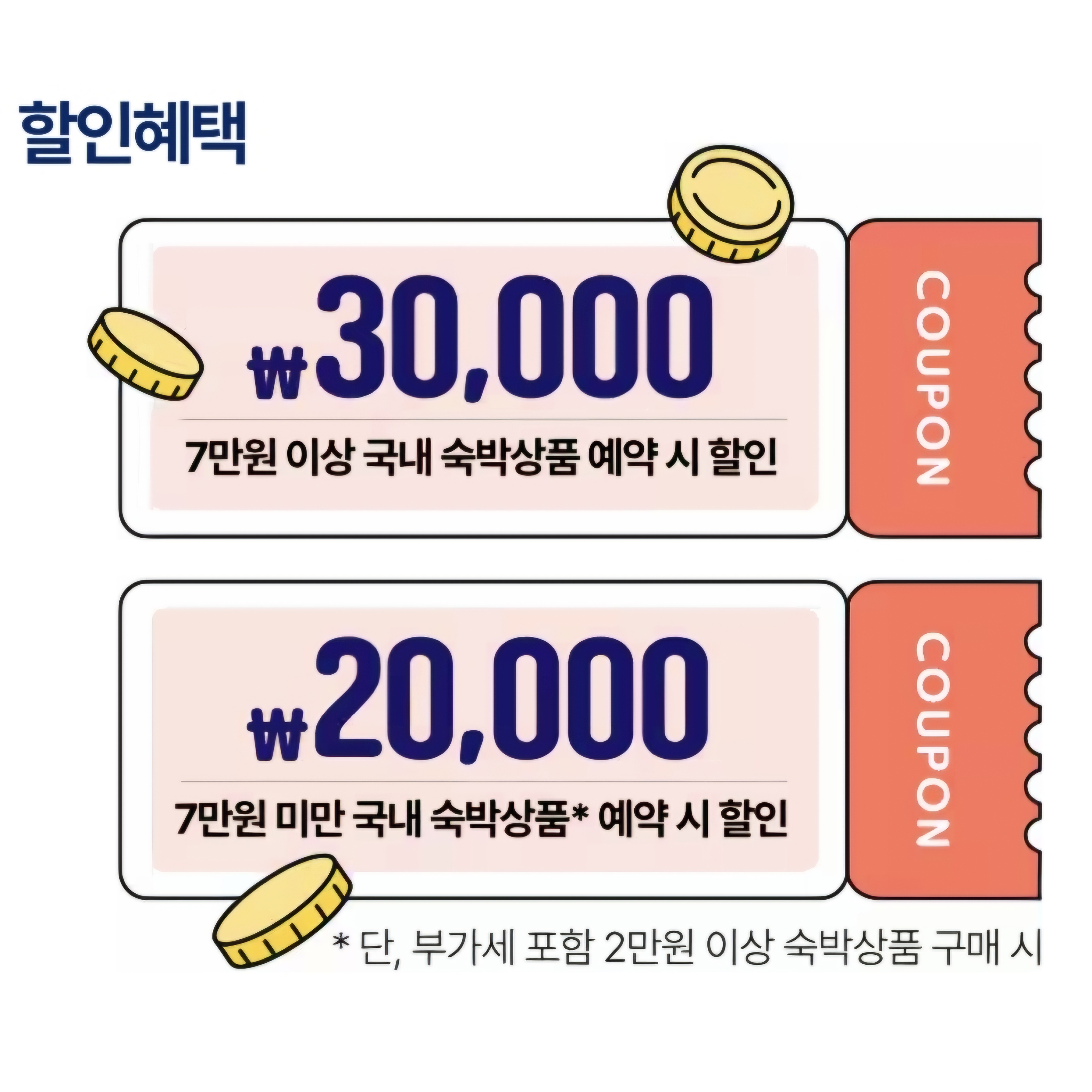 ■ 할인쿠폰: 7만 원 이상 국내 숙박상품 예약 시 30,000원 또는 7만 원 미만 국내 숙박상품 예약 시 20,000원
