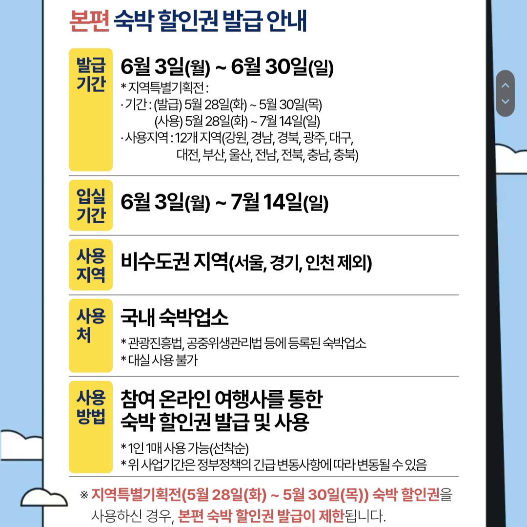 ※지역특별기획전(5월 28일 ~ 5월 30일) 숙박 할인권을 사용하신 경우, 본편 숙박 할인권 발급이 제한됩니다.