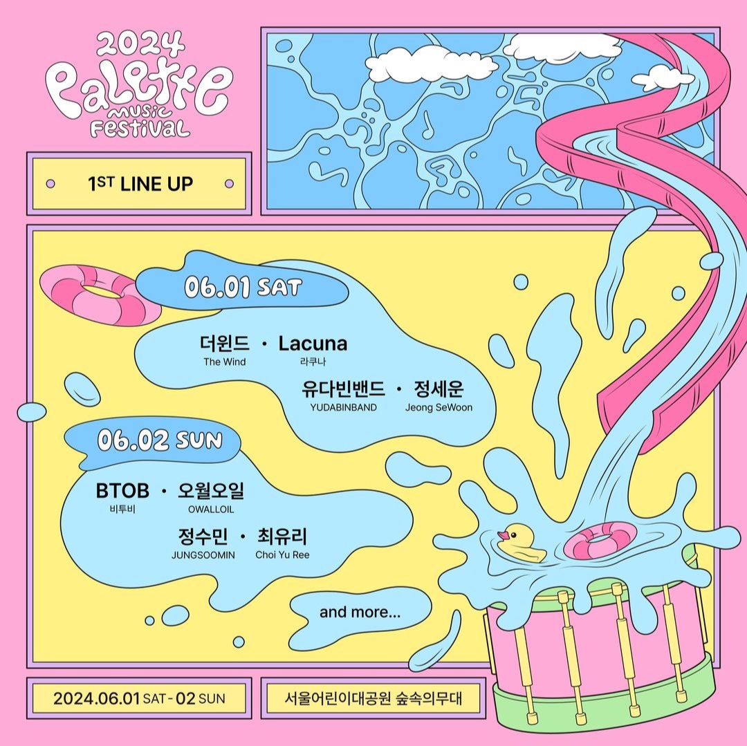 2024 팔레트 뮤직 페스티벌의 1차 라인업이 공개되었습니다. 2024년 6월 1일 토요일 라인업은 더윈드, 라쿠나, 유다빈밴드, 정세운이고, 2024년 6월 2일 일요일 라인업은 BTOB, 오월오일, 정수민, 최유리입니다. 2차 라인업은 추후 공개된다고 합니다.